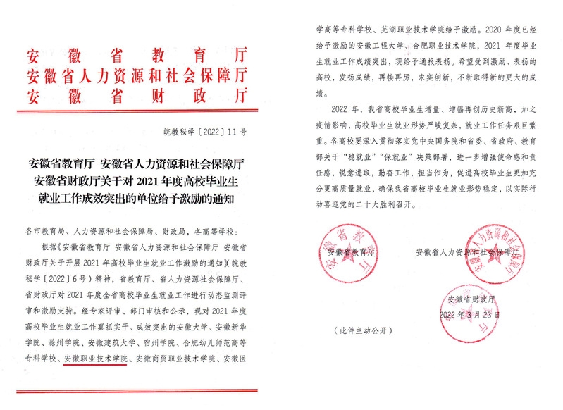 近日,安徽省教育厅、安徽省人力资源和社会保障厅、安徽省财政厅联合下发《关于对2021年度高校毕业生就业工作成效突出的单位给予激励的通知》文件,安徽职业技术学院荣获2021年度高校毕业生就业成效突出激励。全省仅5所高职院校获此殊荣。