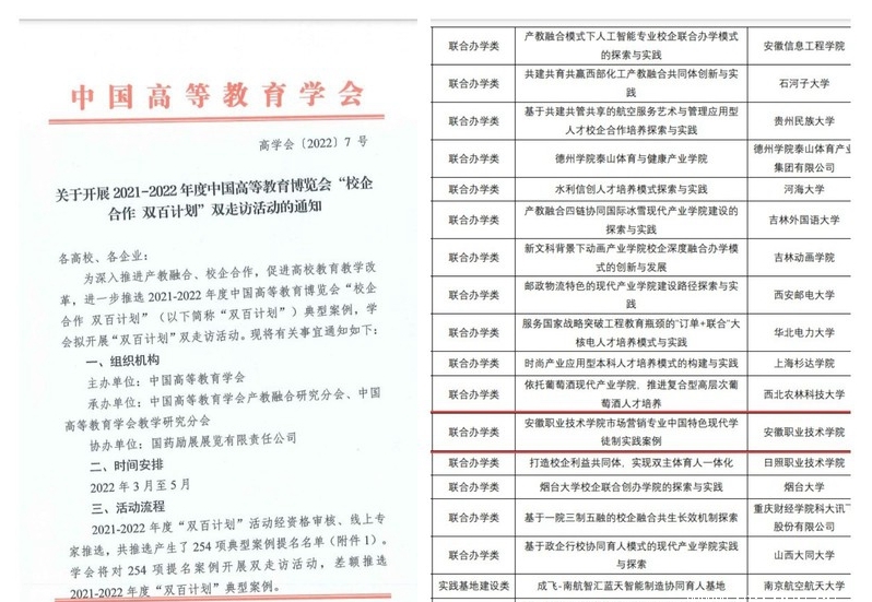 在中国高等教育学会主办的2021至2022年度中国高等教育博览会“校企合作 双百计划”典型案例评选中,安徽职业技术学院选送的“安徽职业技术学院市场营销专业中国特色现代学徒制实践案例”产教融合校企合作案例获得提名。
