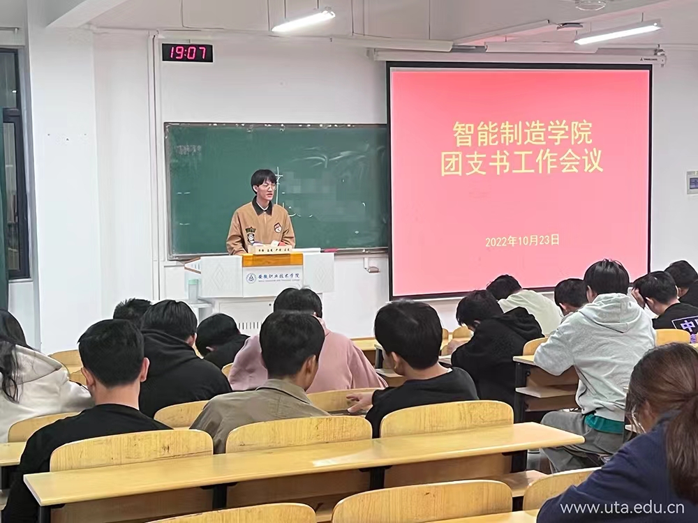 为贯彻落实新时代全面从严治团要求、推进部署近期重点工作,帮助团支部更好发挥管理团员、教育团员、服务青年、凝聚青年的职责,智能制造学院团总支于10月23日晚在教D103召开团支书工作会议,团总支书记左皓、团总支组织部干事及各班团支书参加了此次会议,会议由左皓主持。