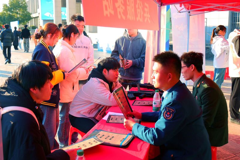 招聘会现场,“先锋宣讲团”成员与学生处征兵办工作人员分工协作,围绕2025年征兵政策要点、入伍条件、报名流程、体检标准等学生关心的核心问题,开展“一对一”精准解答。现场还设置了政策宣传展板,发放征兵宣传手册200余份,累计接待咨询学生百余人次,有效解决了部分学生对征兵政策“一知半解”的问题。
