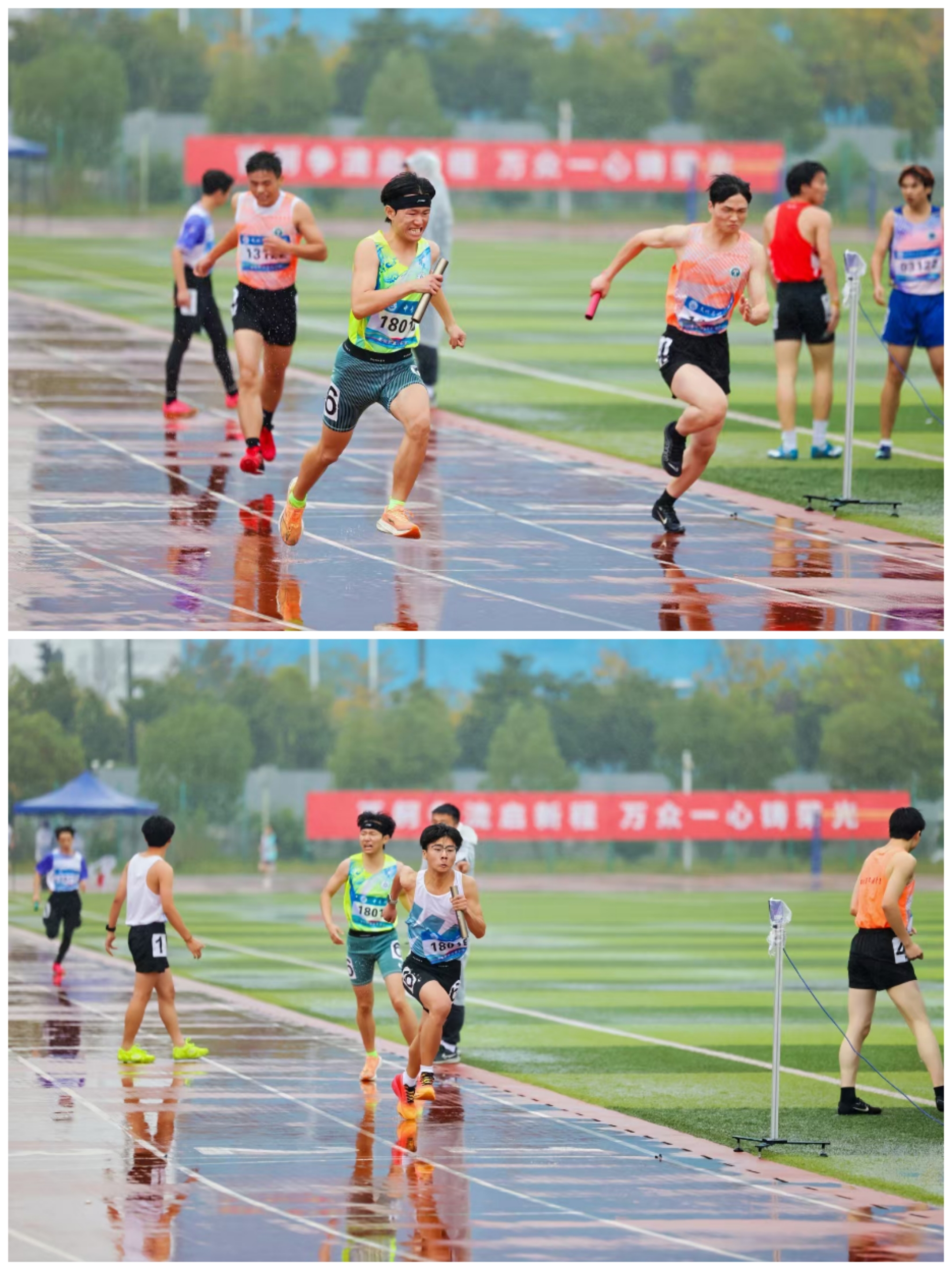 田径赛场上,持续的降雨让赛道湿滑难行,为这场考验速度与协作的接力赛增添了重重挑战。中专部韦家继、郭旭、吴涛、刘心成四位同学组成的接力队,面对恶劣天气与强劲对手,始终秉持“团结协作、永不言弃”的信念,以饱满的热情和昂扬的斗志全力以赴。